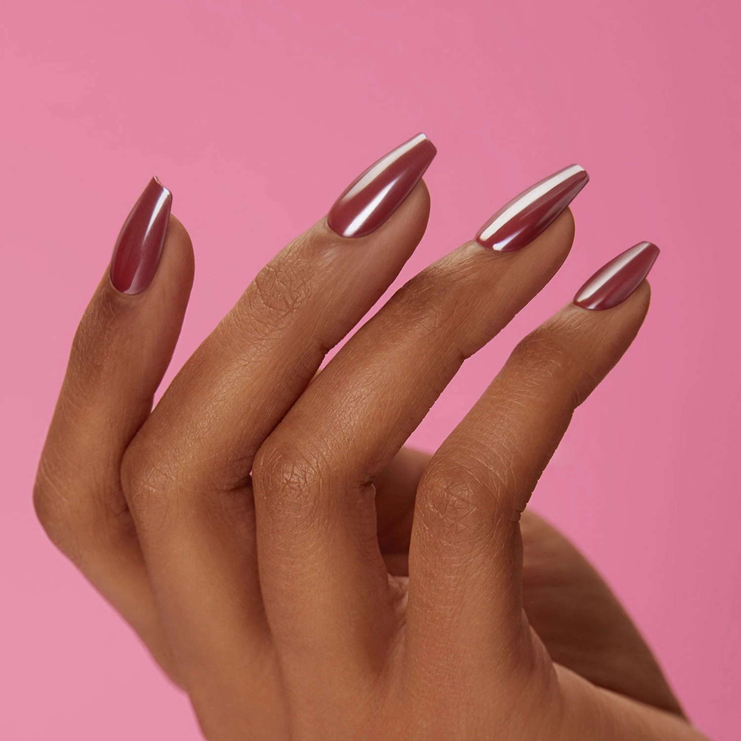 Deep purple press-on gel nails featuring, long length, coffin shape, and a shimmery chrome finish.