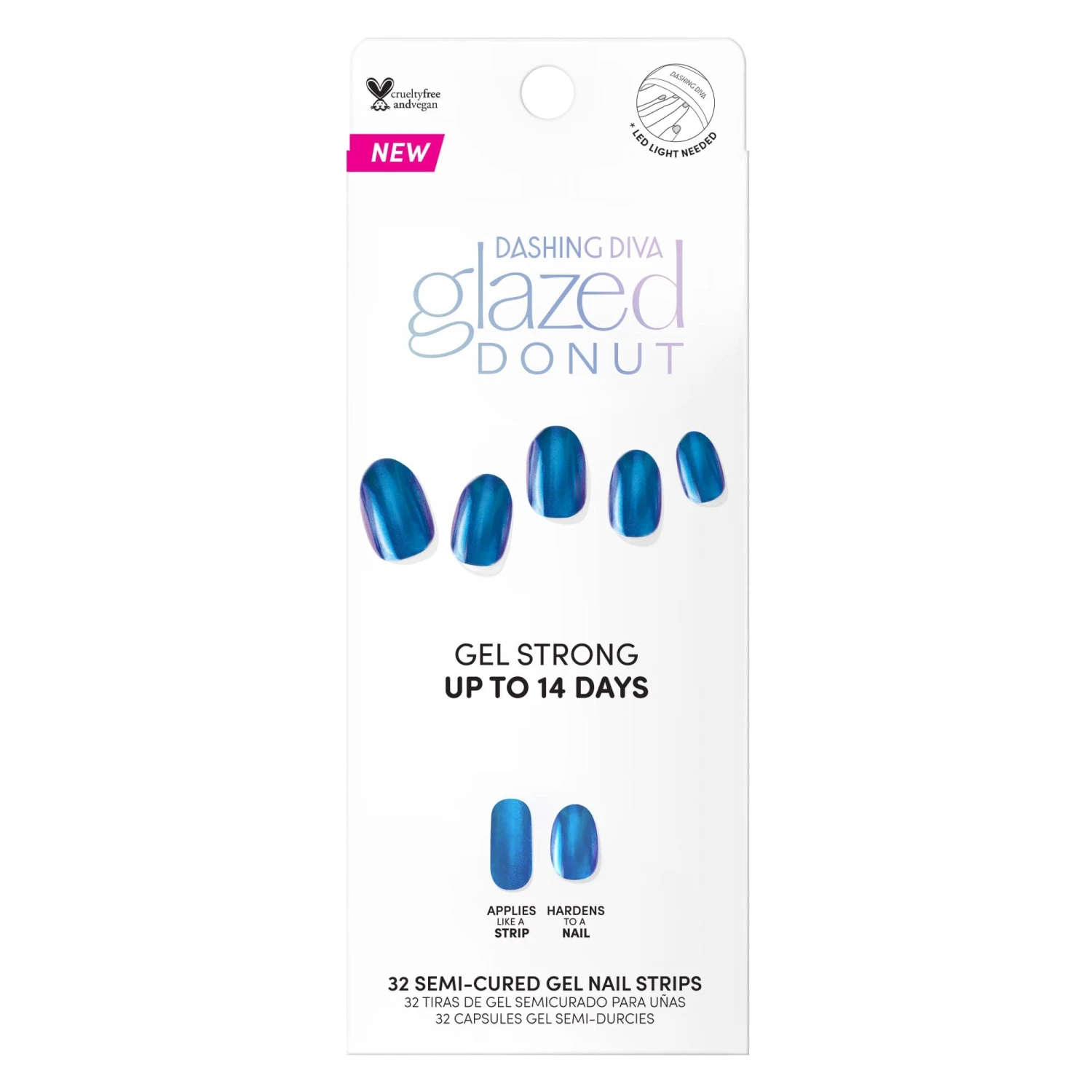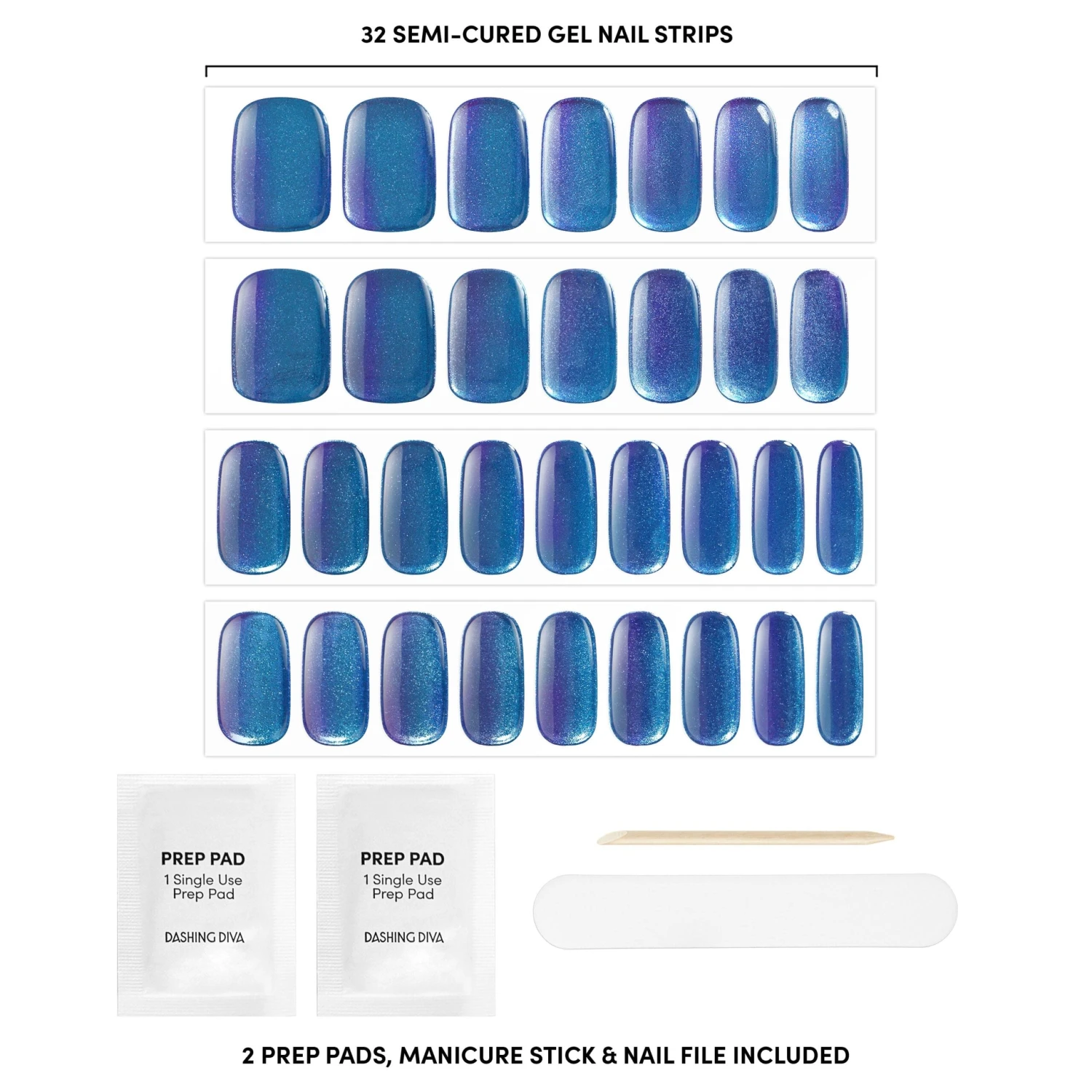 Semi-cured blue metallic chrome gel nail strips with mega volume & maximum shine.