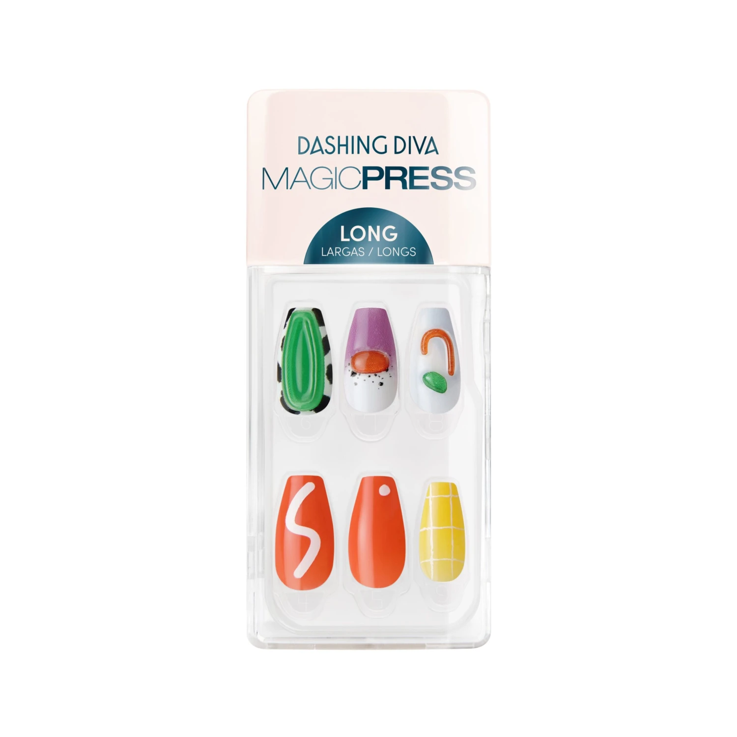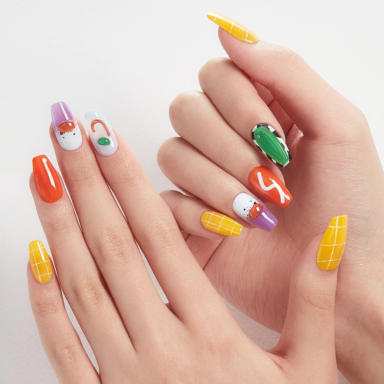 Long length, coffin shape, glossy finish multicolored press-on gel nails featuring 3D abstract art accents.