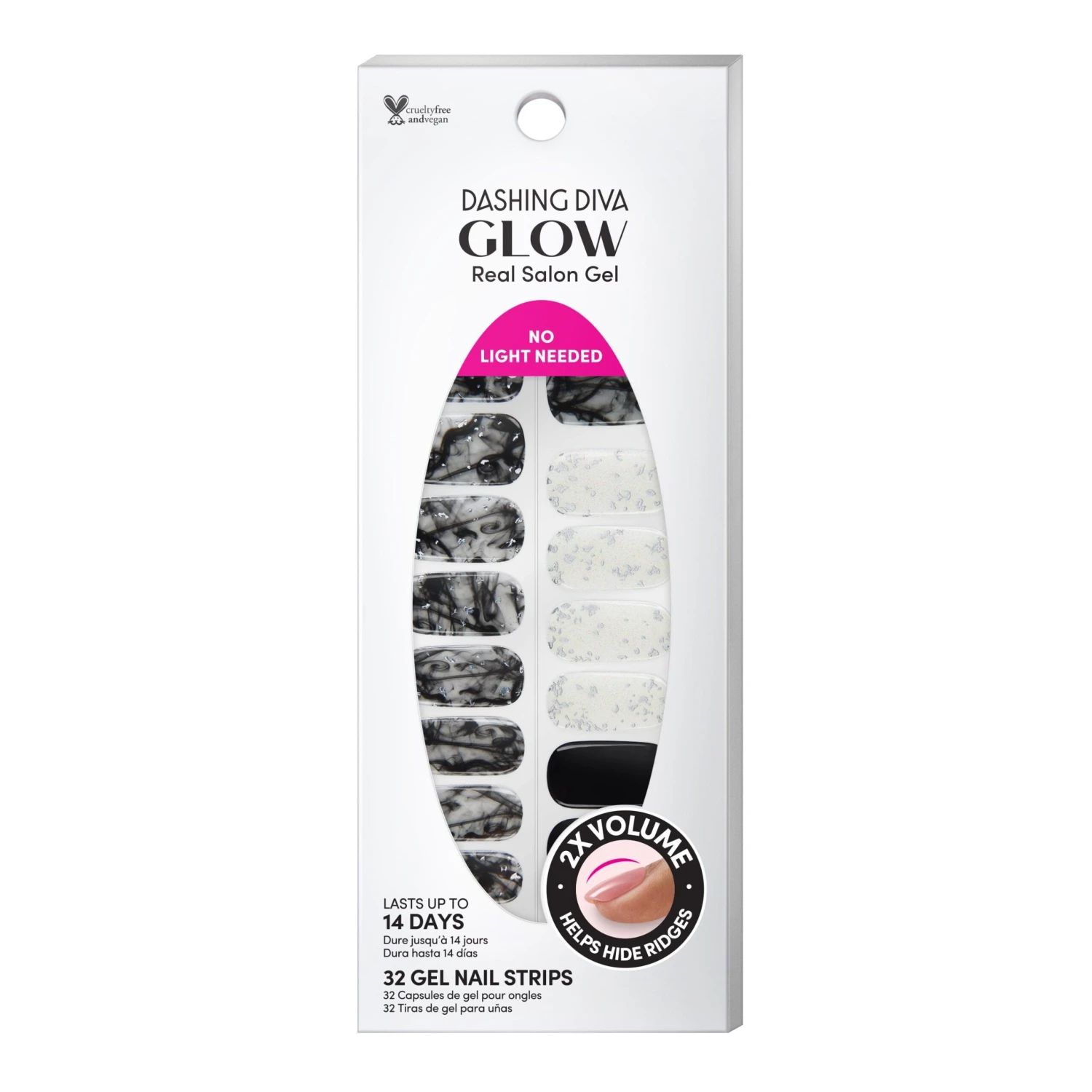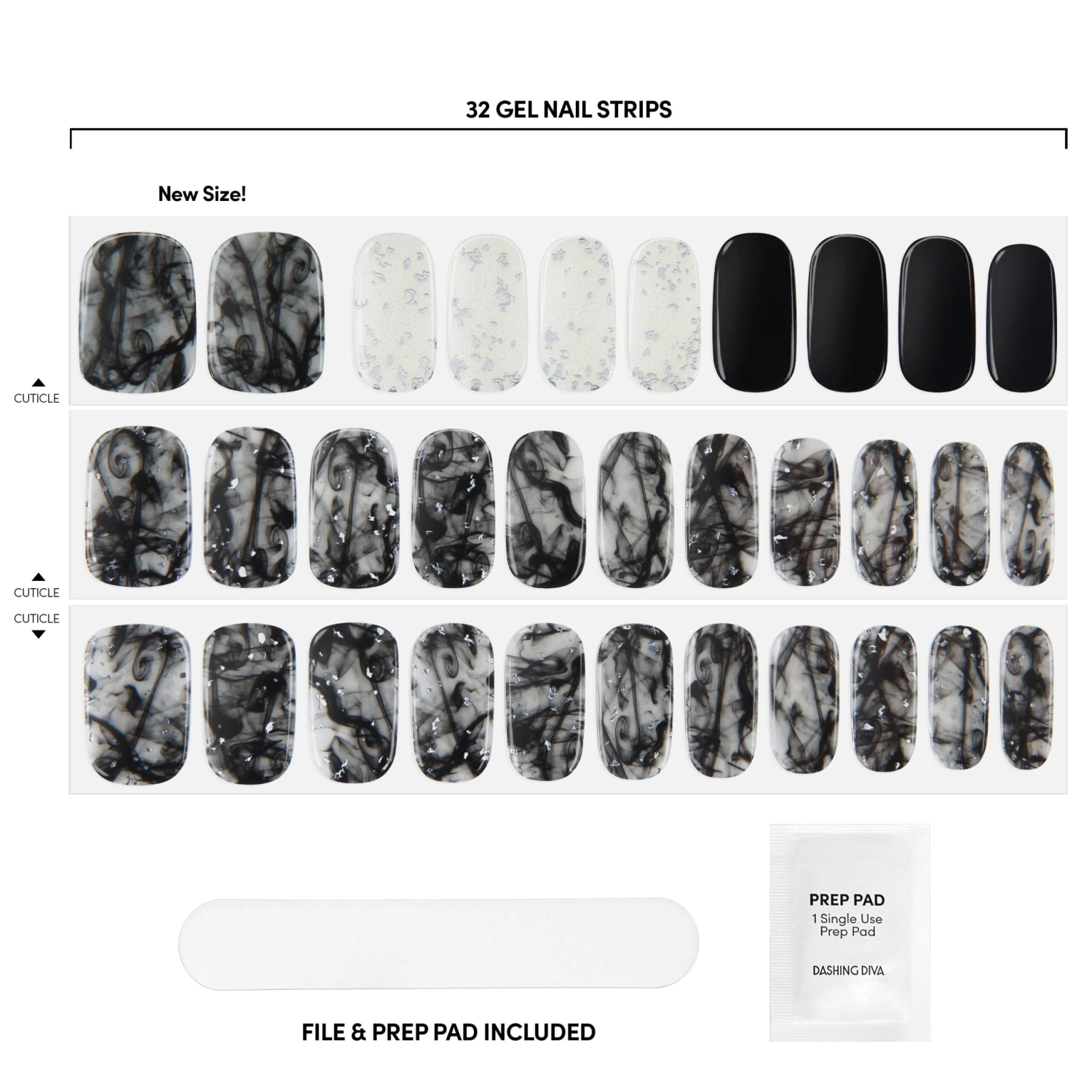 Sheer black, solid black, and clear gel nail strips featuring smokey accents and silver foil with a double gel formula for an ultra-smooth finish.