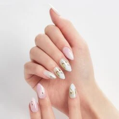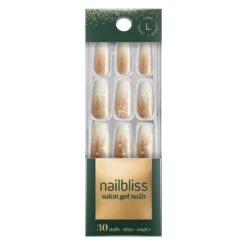 Sunkissed in the summer, snowkissed in the winter. Long length, coffin shape, glossy finish. Milky white glue-on gel nails featuring ombré gold glitter and snowflake accents.