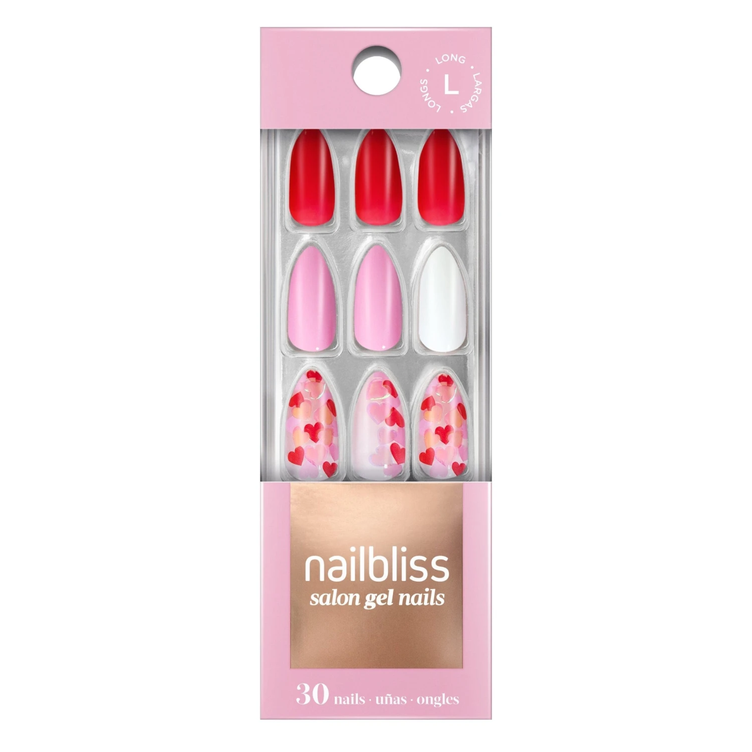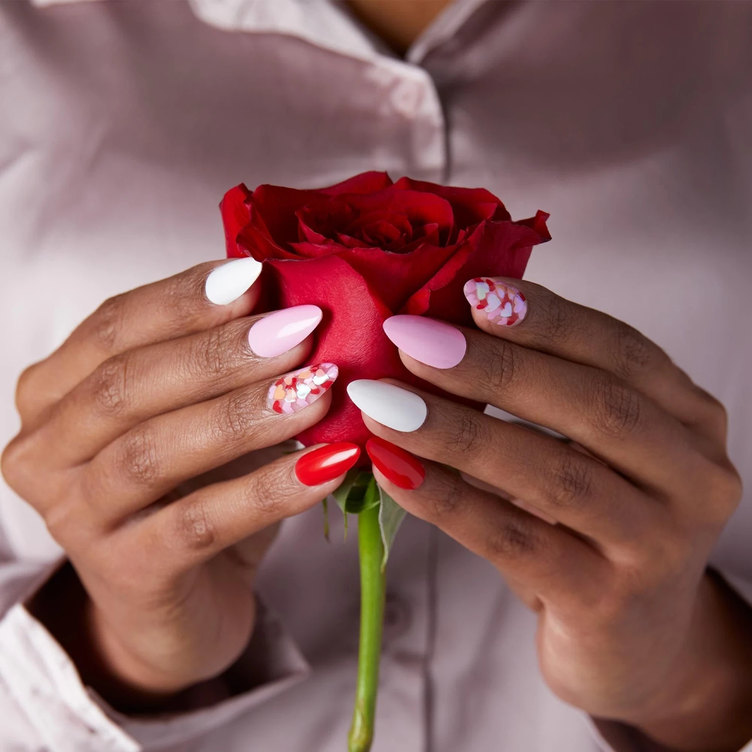 Long length, stiletto shape, glossy finish. A mani as sweet as candy and a Valentine’s kiss!