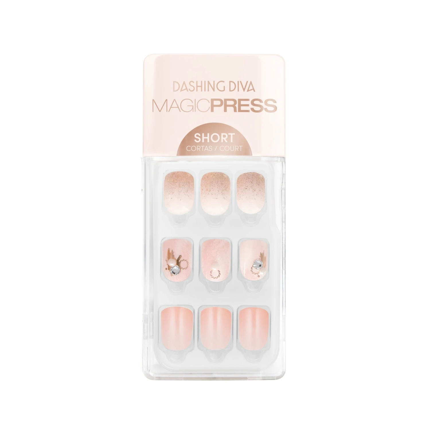 Three-dimensional lunar beauty will have you shining ultra bright through the night. Short length, square shape, glossy finish nude pink press-on gel nails featuring rhinestones, pearls, and metallic details.