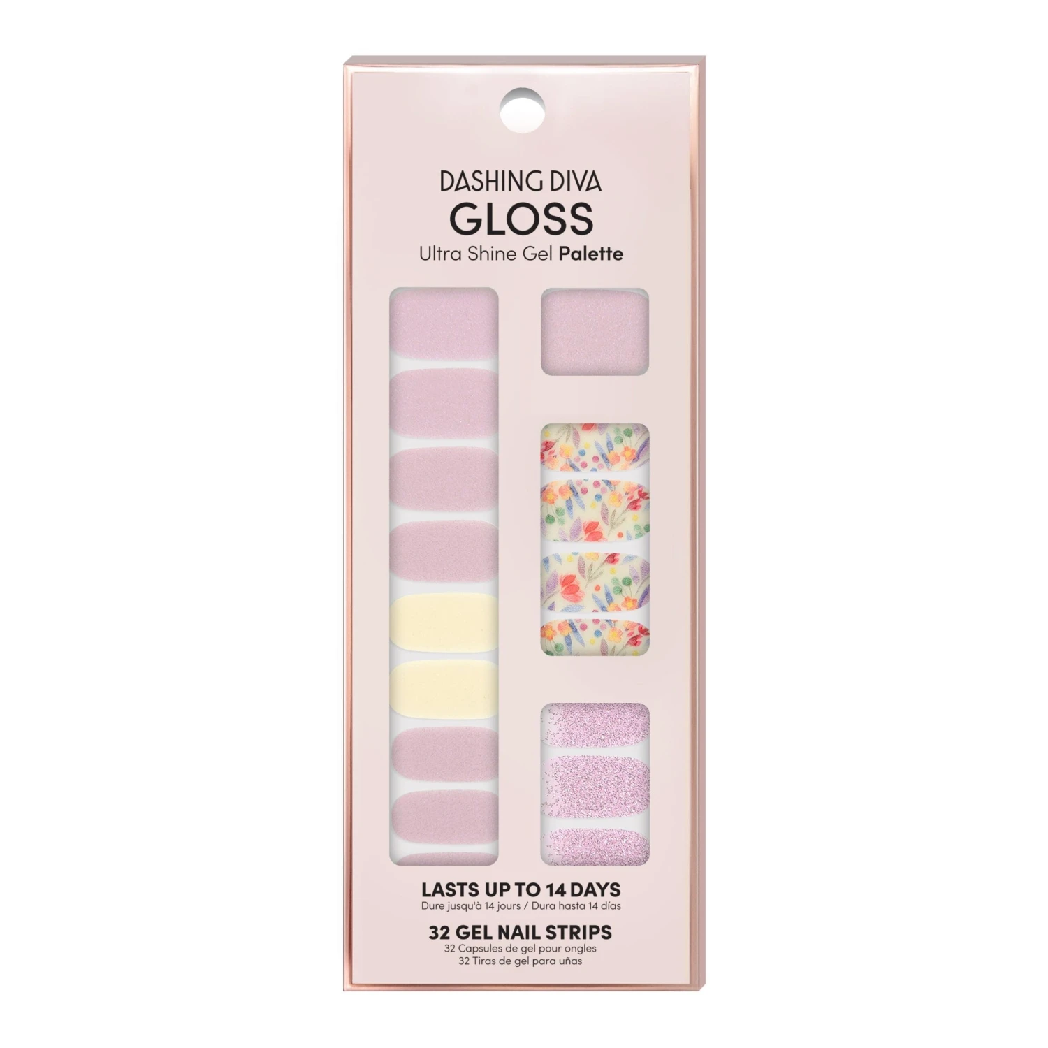 After a long winter, bring some Spring Shimmer to your nails! Glittered chromatic purple and pearlescent yellow nail strips featuring pressed flowers and ombre glitter accents with a glossy, high-shine finish.