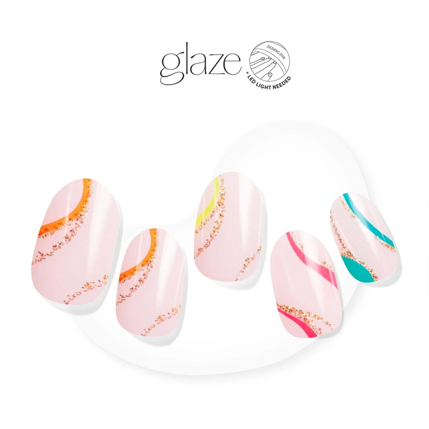 Semi-cured sheer nude pink gel nail strips featuring neon, multicolor swirls & gold glitter with mega volume and maximum shine.