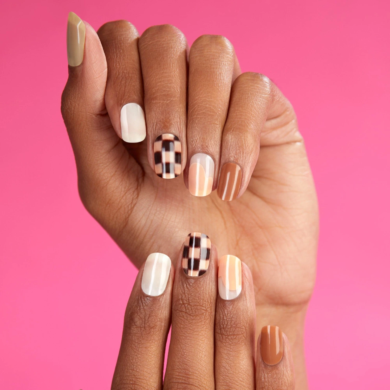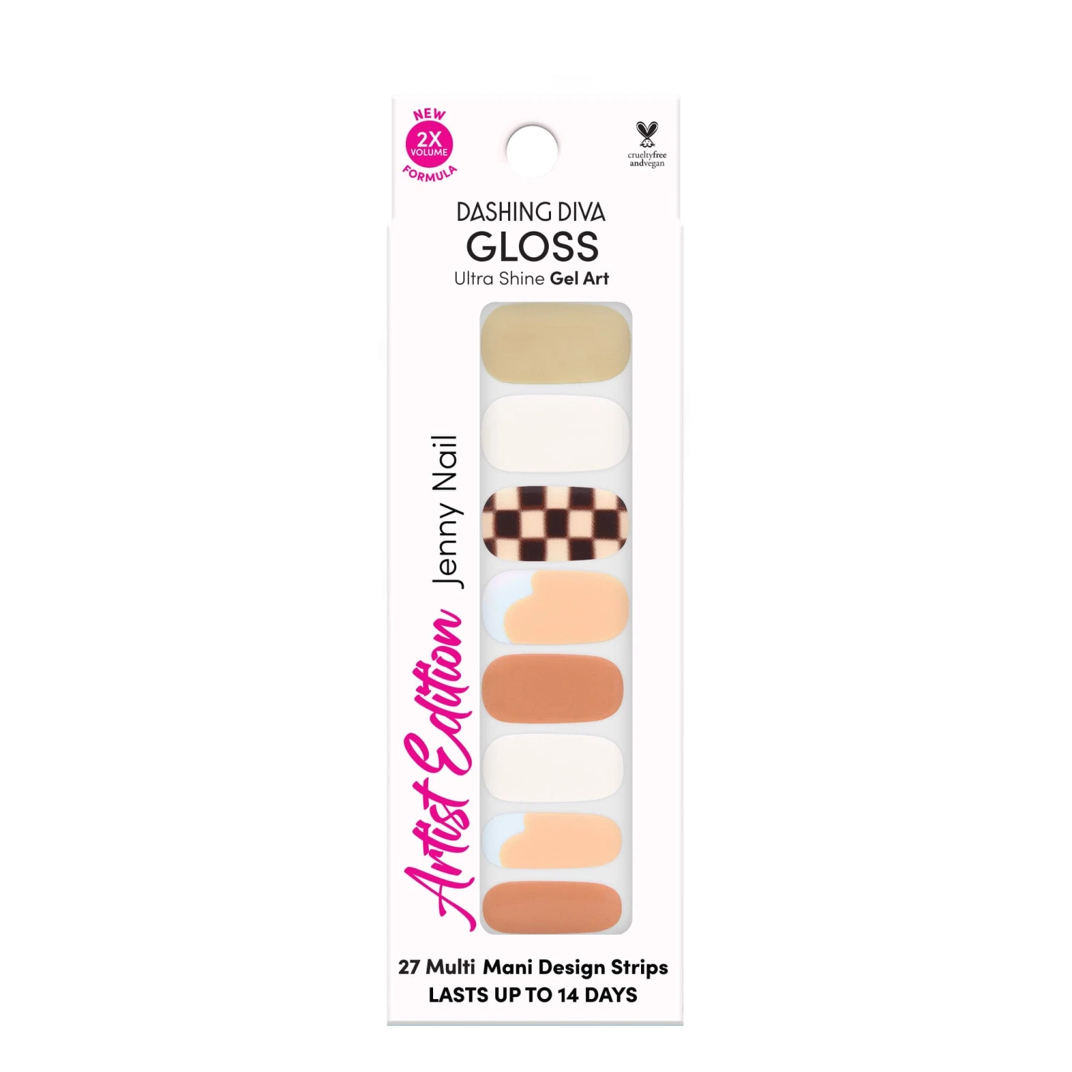 Dream of all the mani masterpieces you could make with such fine nail art! Multi-design gel nail strips featuring nude abstract French tips, brown checker print, and sage green marbling with 2x the volume of Gloss and its original, high-shine finish. Features nail art created by nail artist Jenny Nail, in collaboration with Dashing Diva.