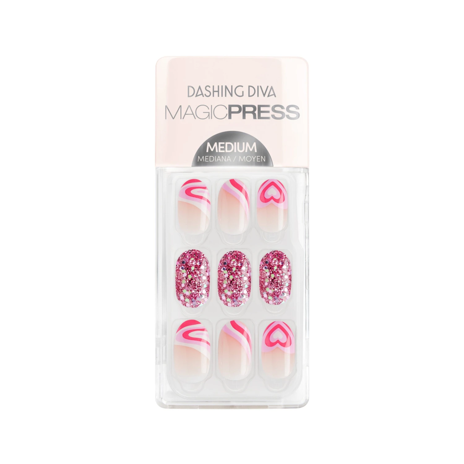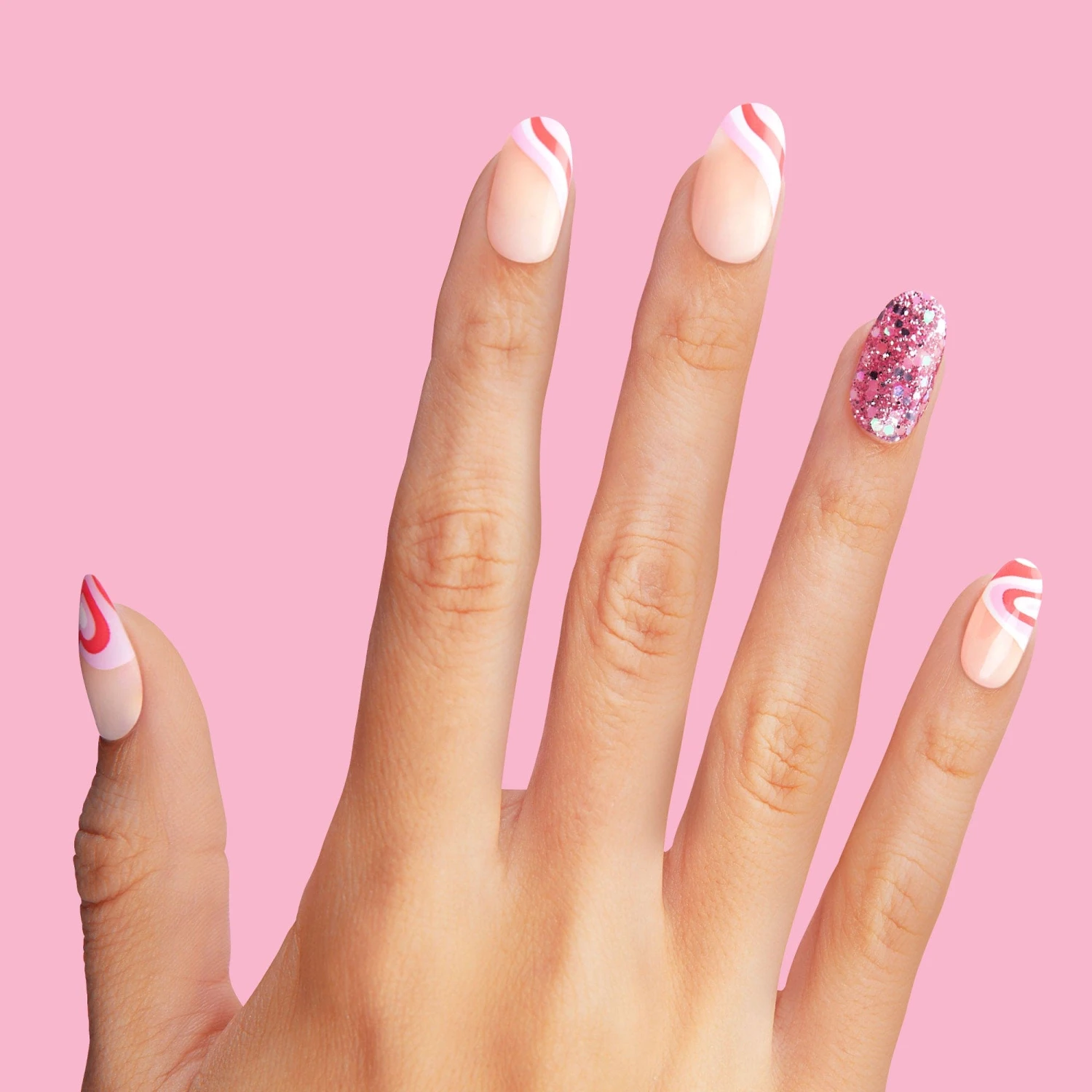 Medium length, oval shape, glossy finish nude press-on nails. Featuring pink glitter accents and a French tip swirl in pink, white, and red.