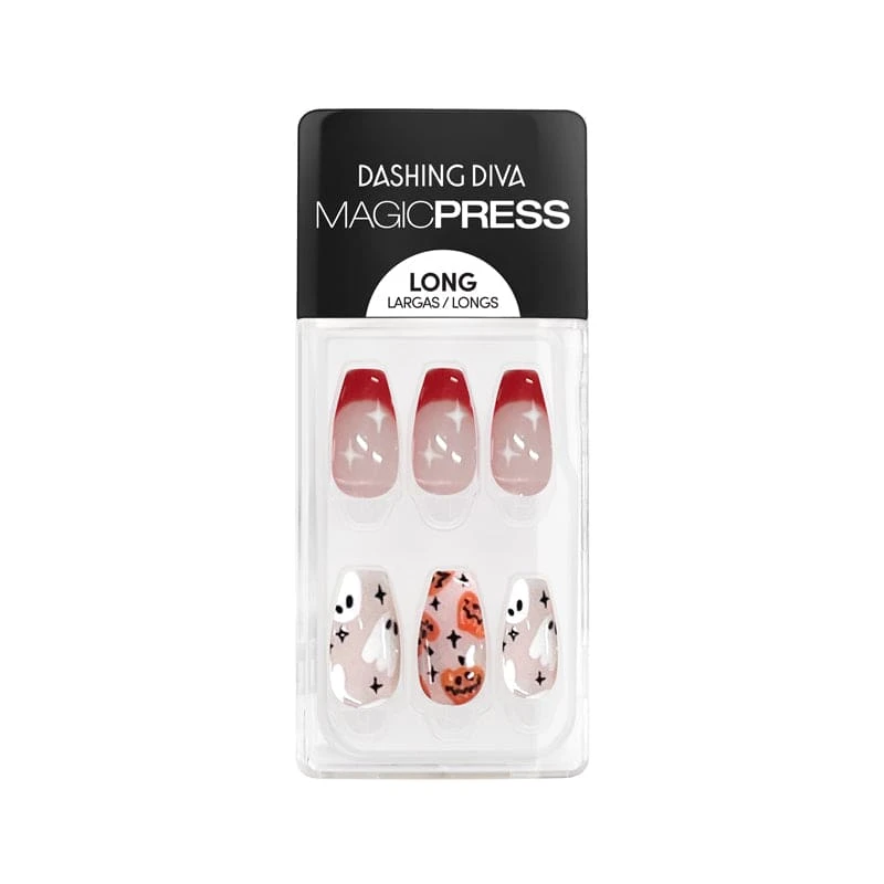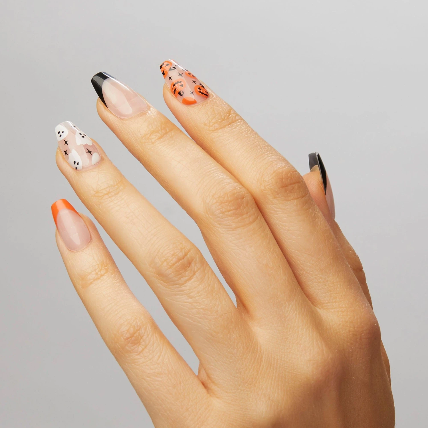 Long length, coffin shape, glossy finish. Sheer nude press-on gel nails featuring black & orange french tips, ghost icons, and jack-o-lanterns.
