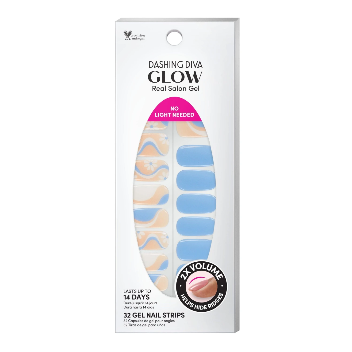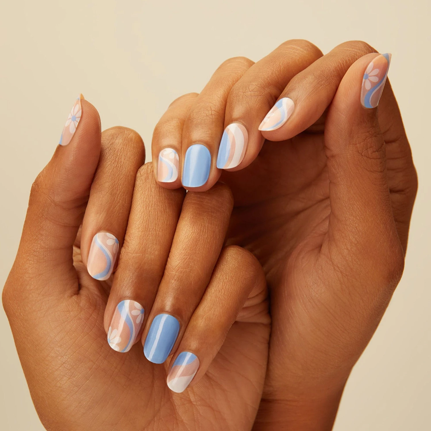 Sky blue gel nail strips featuring abstract swirls and floral accents with a double gel formula for an ultra-smooth finish!